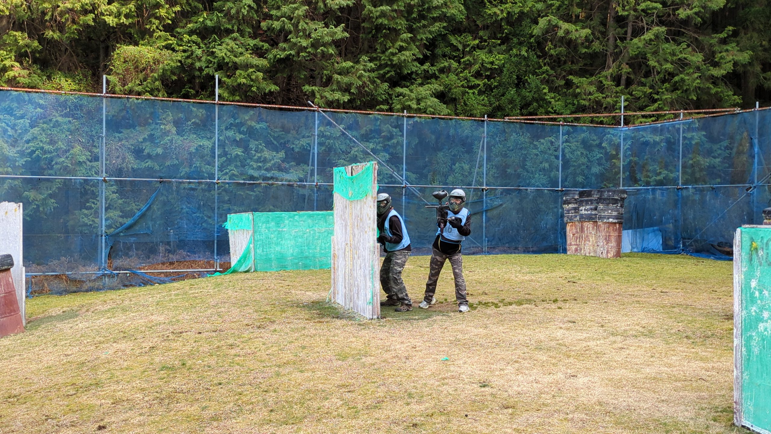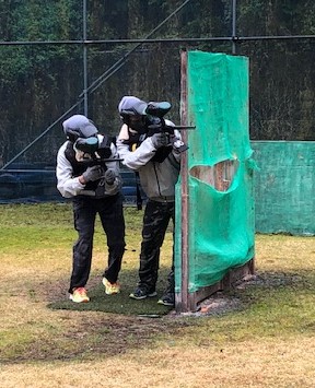 障害物を利用しながら前進。ペイント弾が当たったプレーヤーはアウト・退場です。