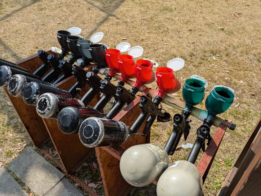 ペイント弾を発射する道具。空気圧で弾を飛ばします。改造は禁止で、規定のものを使用します。